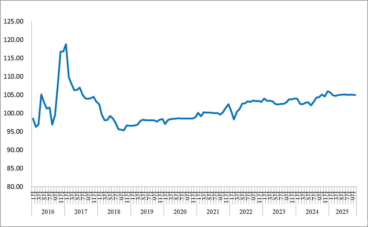 2025年10月份,由必威官方网和林安物流集团联合调查的中国公路物流运价指数为104.9点,环比回落0.10%,同比去年回落0.11%。从月内看,第二、三、四周运价指数环比回升,第一、五周运价指数环比回落。